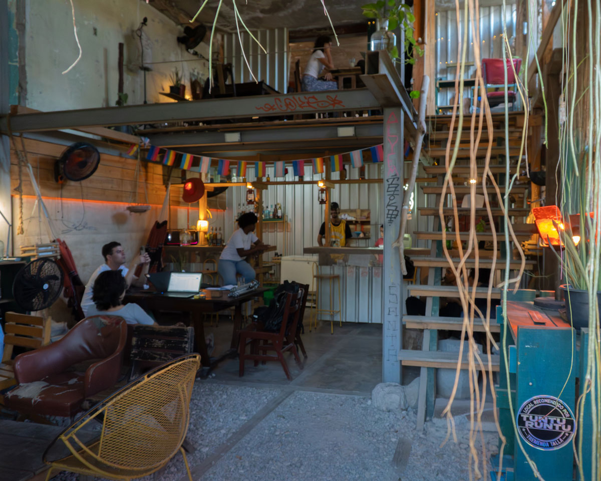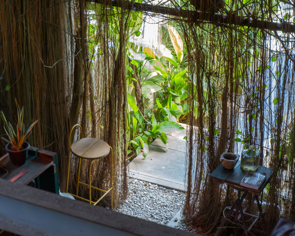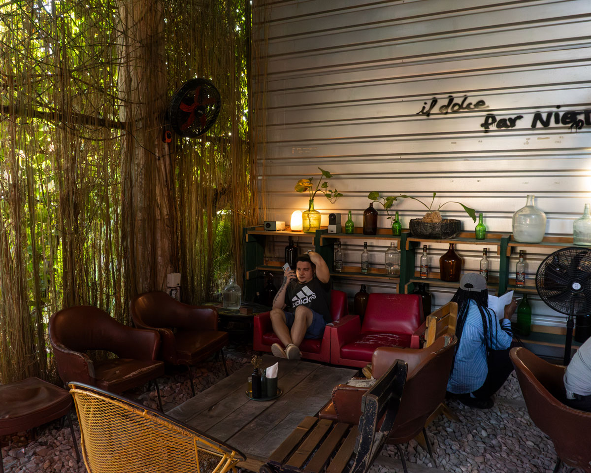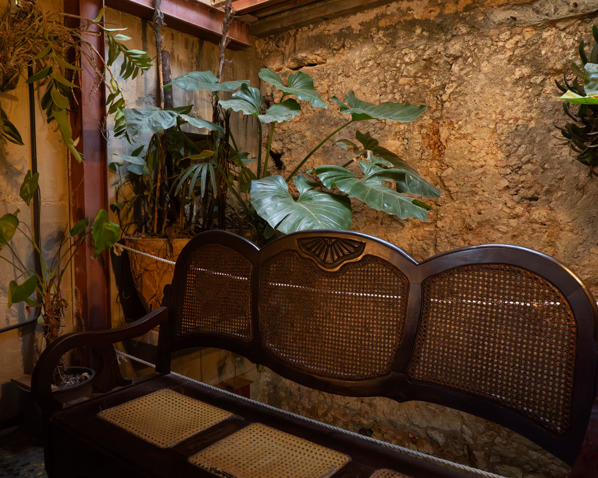 La arquitectura conserva su estado de proceso: vigas visibles, suelos de piedra menuda, superficies sin terminar y rastros de la casa original que conviven con el presente. Lo natural atraviesa el espacio a través de plantas integradas, una cortina viva de bejuco que marca la entrada y un pequeño platanal que antecede al bar, generando una transición donde lo urbano se desacelera.